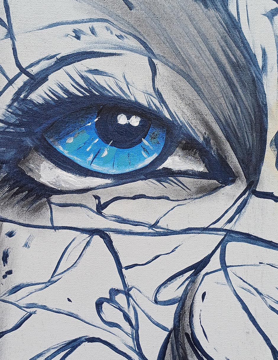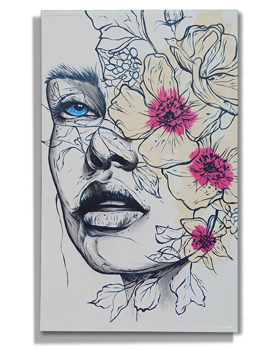 Con una técnica exquisita en acrílico y carboncillo sobre lienzo de alta calidad, sin marco.